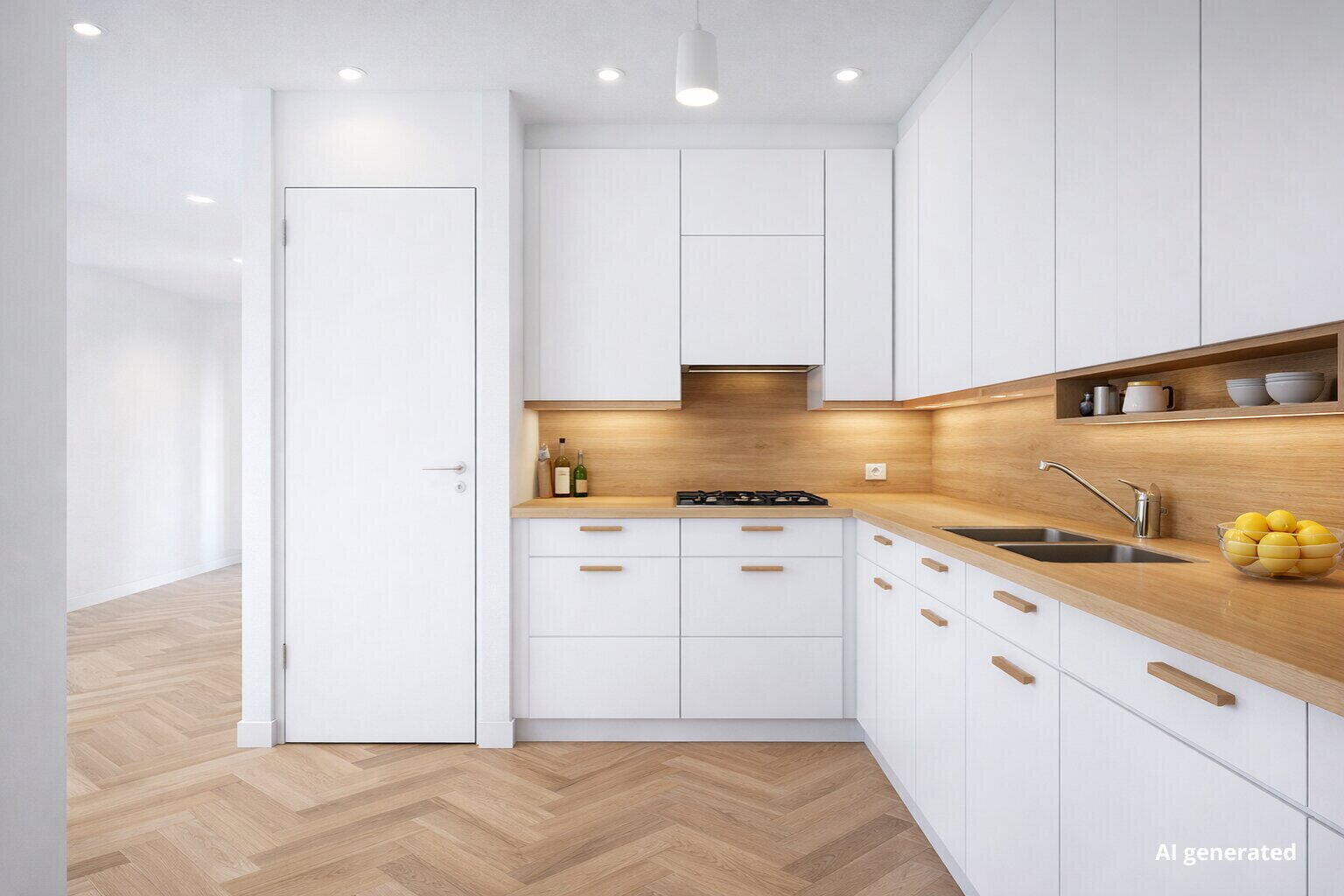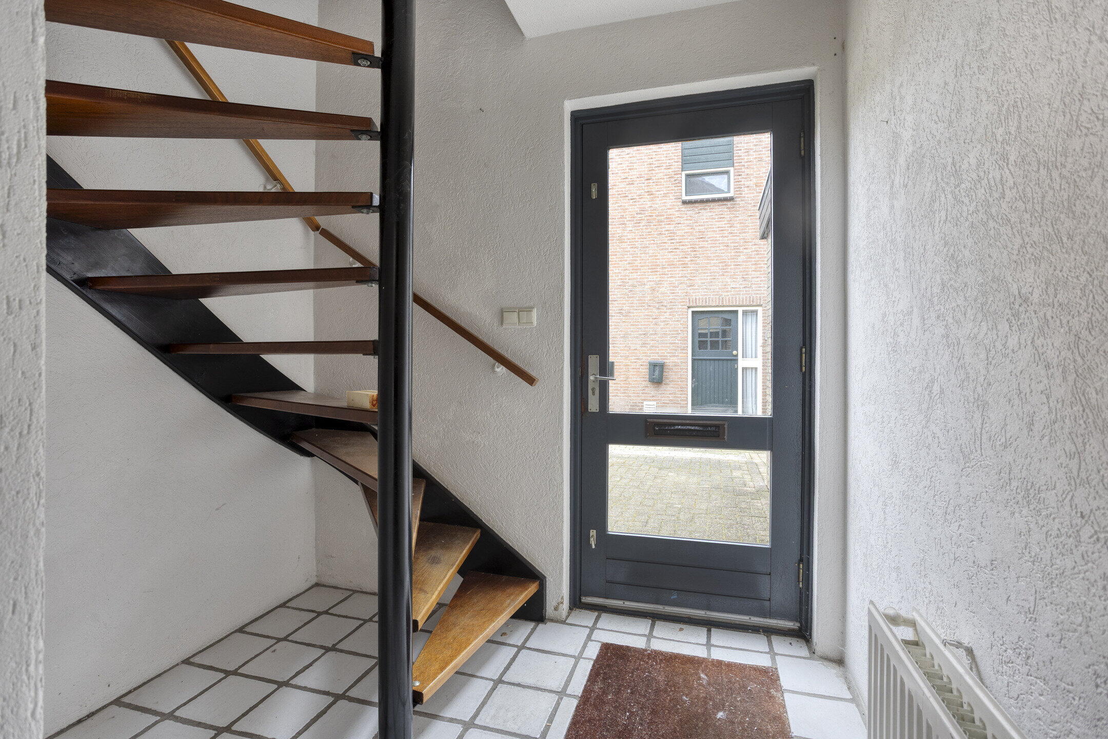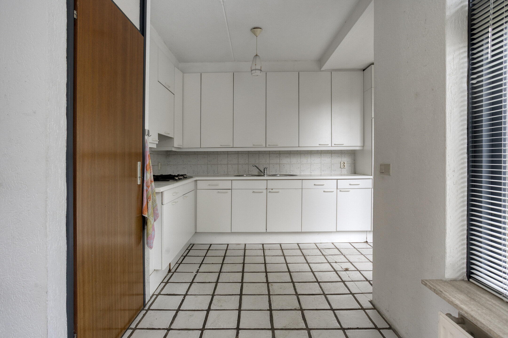 Entree met toiletruimte en fontein, meterkast en toegang tot de woonkamer. De woonkamer is opvallend licht dankzij de grote raampartijen aan de voorzijde en biedt volop ruimte voor een royale zithoek. Door de diepe voortuin en de ligging in het hofje geniet je hier van privacy terwijl je toch prettig naar buiten kijkt. De open keuken is ruim van opzet en biedt volop mogelijkheden voor het realiseren van een moderne woonkeuken. Momenteel voorzien van een riante hoekopstelling en veel lichtinval.