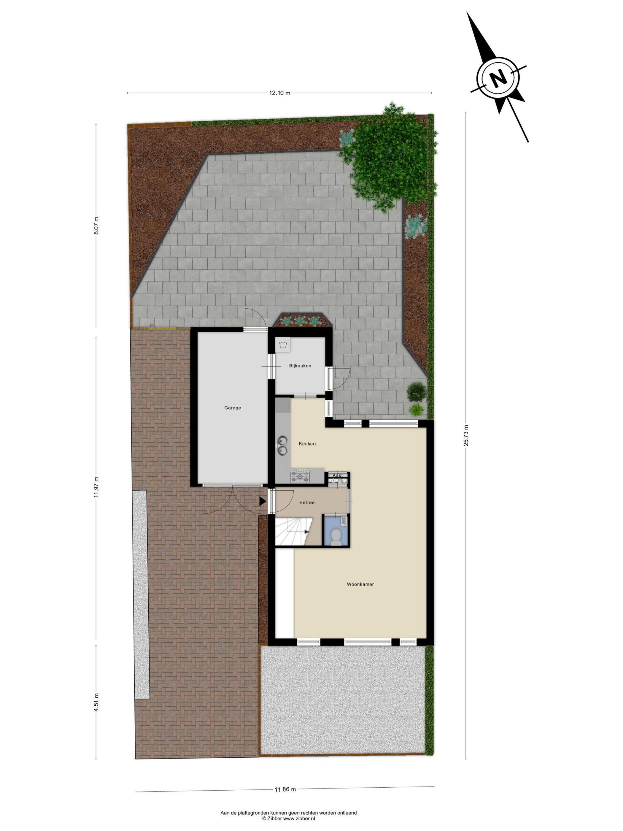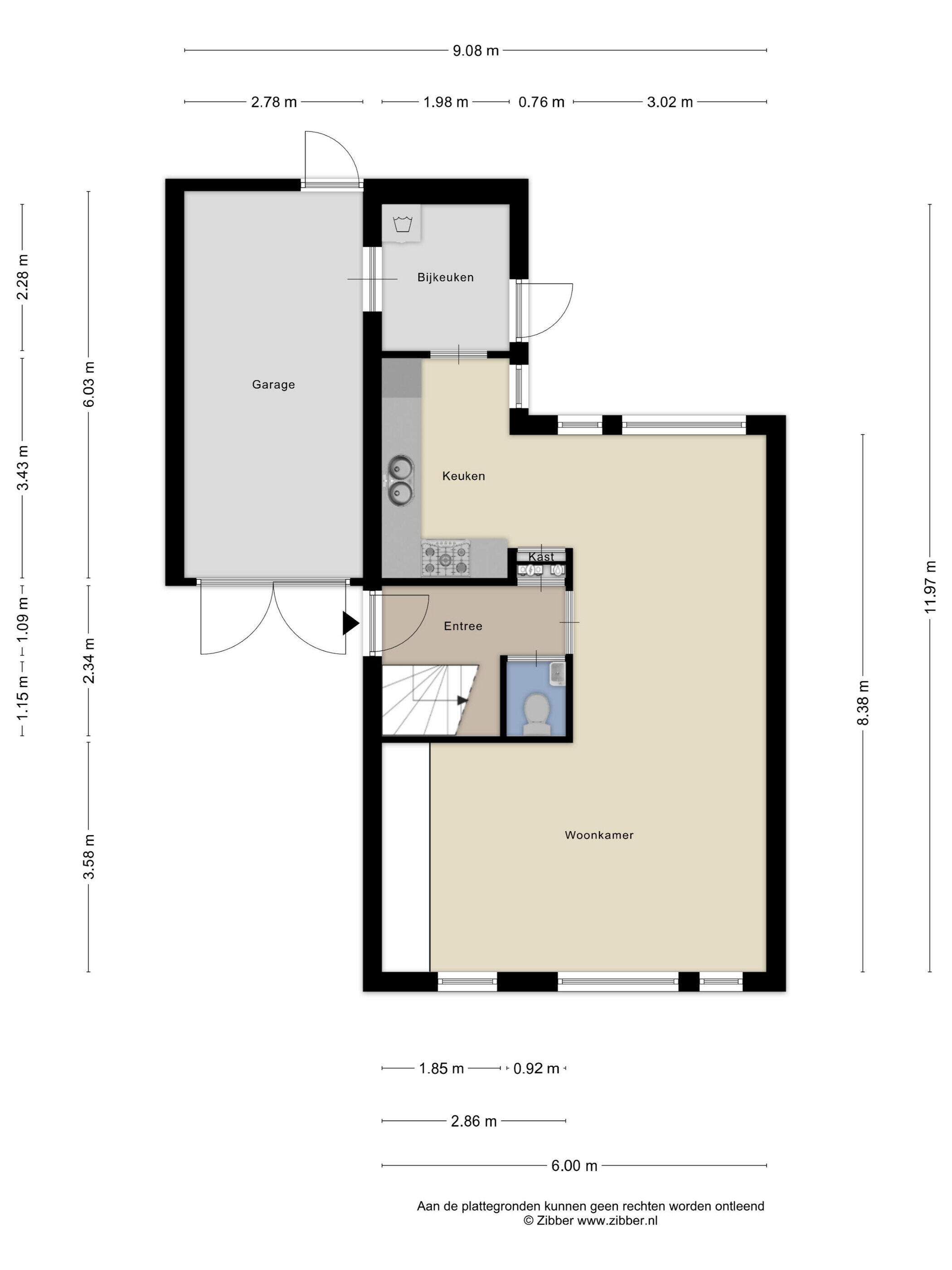 - 109 m² (9.5 meter diep en 11.5 meter breed)
